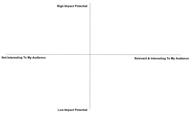What I love about this diagram is that it forces you to think about the two things that actually matter: how interesting + relevant something is to your audience, and how much potential impact a given topic/article can have on your business (defined as traffic volume * conversion rate * expected value of a conversion) if that content is distributed in a systematic + comprehensive manner to your audience.