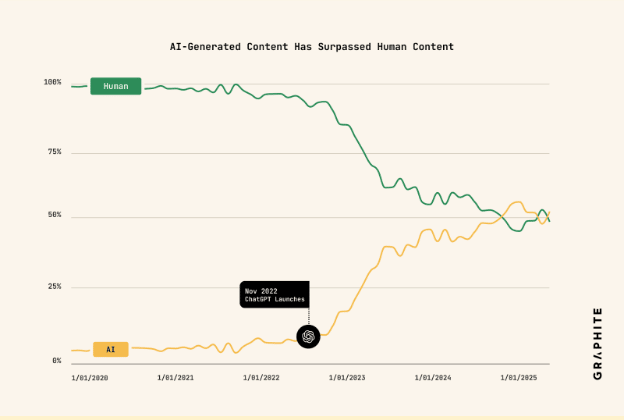 Long story short: for the first time, there is more AI-generated content on the internet than human-created content. That’s staggering: in just ~3 years (ChatGPT launched in November 2022), AI has created more content than humans have managed to produce (and digitize) in 10,000 years.