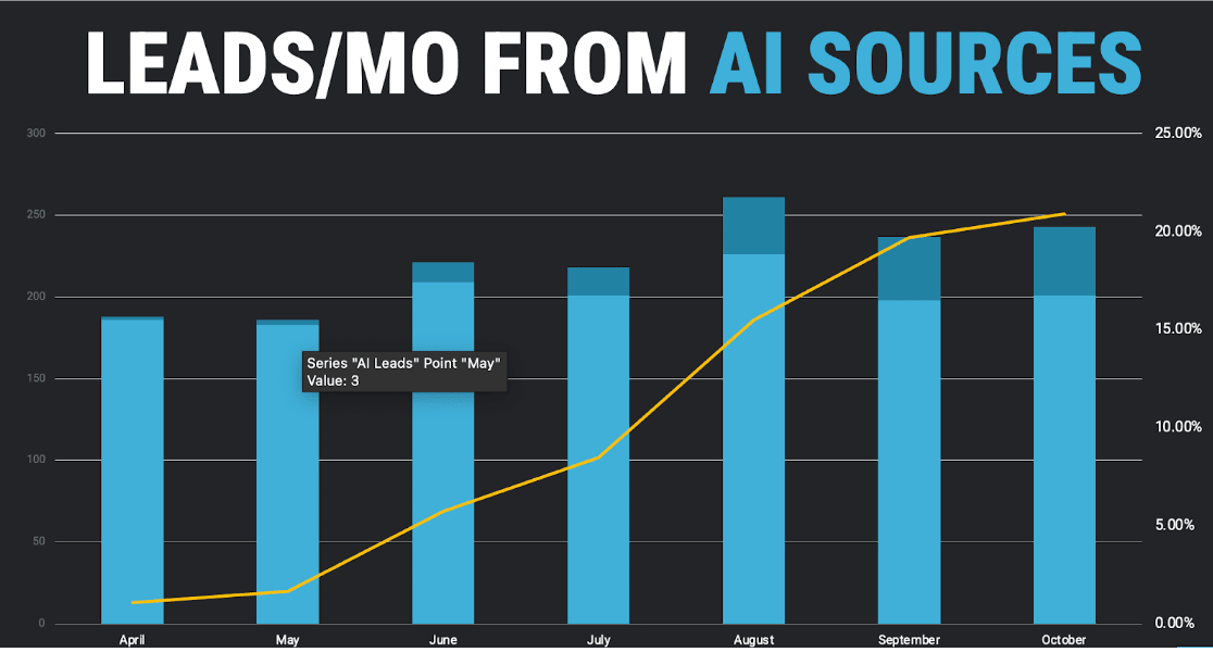 The chart below shows the total volume of leads for a brand over 7 months in 2025 (I was lazy and wanted to wait until January to update this, so we have all 2025 data in) – the light blue is non-AI leads; the dark blue is leads from AI sources. The yellow line shows the share of AI leads. This is not a particularly large site/business (it’s a B2C lead gen business that’s averaged ~150-200 leads/mo) - but you can see two things: (1) the share of AI leads has exploded - from <5% to >20% in just 7 months and (2) many of those leads are incremental.